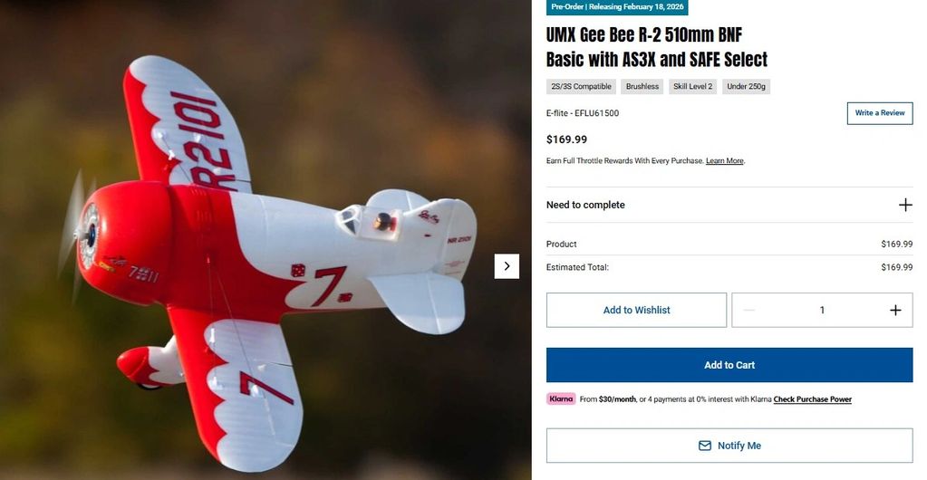 UMX Gee Bee R-2 510mm BNF Basic with AS3X and SAFE Select $169.99